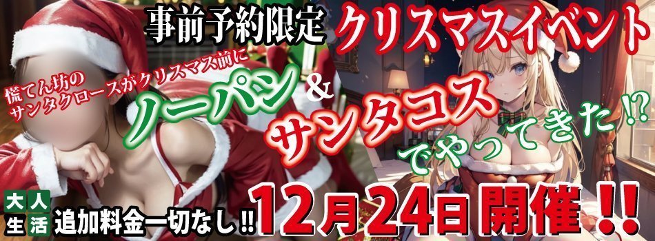 こちらのイベント日に事前のご予約をしていただきますと、なんとご指名の女性を『ノーパン&サンタコスチューム』にてご案内させていただきます!!