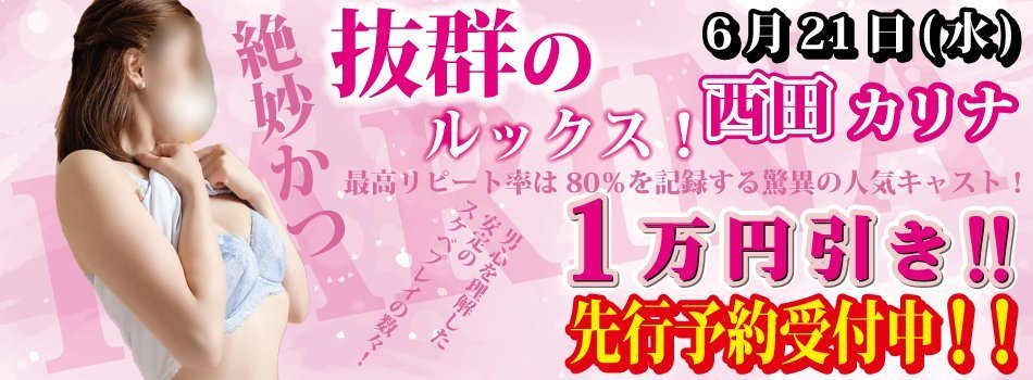 当店の誇る人気キャストの魅力を一人でも多くのお客様に知っていただきたい!そんな願いを込めまして、西田カリナさんをご利用いただいたことのない会員様に限り